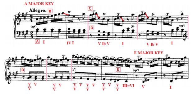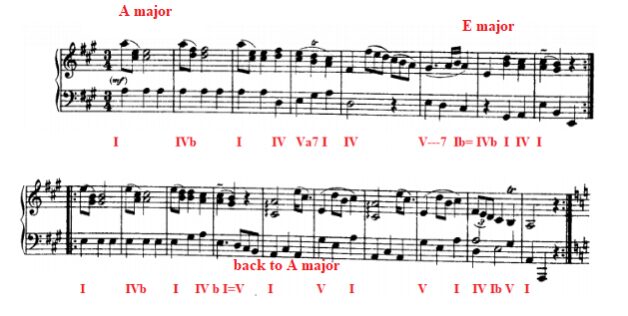 E) In less than two staves, we have already modulated: Now we are in E major key: the dominant key of the initial root A major.