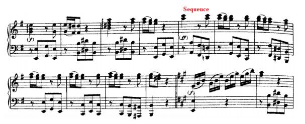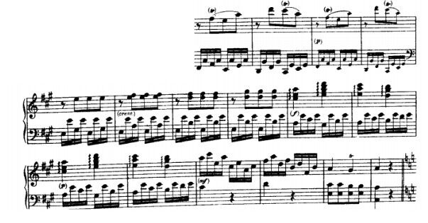After two bars that are played twice, we arrive to a sequence: We can appreciate the left hand repeating the same pattern one note lower each time. The comeback to E major key is explosive and bright, stretching the sound of the ,,piano as we climb with that semiquaver triplets. Once we arrived, the next bars and simple and straightforward and lead us to a nice section-end.