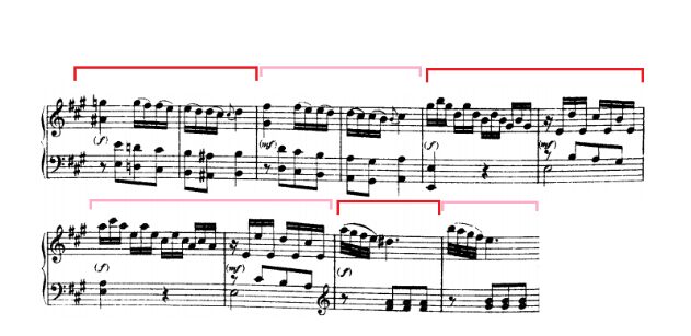 Can you see the red lines in the first four bars? These red lines show us a composition style very used in the period. Fast ascending notes but, instead of reaching a peak by climbing, in the last moment we make a jump down.