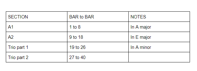 The main theme is built with thirds, jumps, and traditional harmony. The second section shows the theme again, now in the dominant, but we come back to the initial root key before we finish. Less repetition than usual is shown up on this part, just bars 13-14 and 15-16.