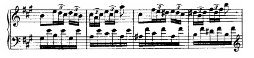 The second line is ruled again by broken chords in both hands, and semiquaver triplets.