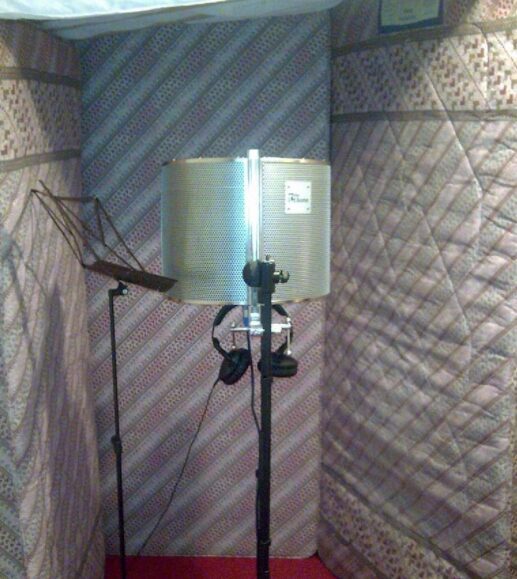 1. On the more expensive end is the Isovox, this is a portable vocal booth that you can place a microphone inside and sing into, the dense acoustic material absorbs the reverberation of your voice and muffles the high frequencies, making it a lot quieter through walls and for neighbours.